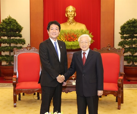 | Sonoura Kentaro (gauche), envoyé spécial du Premier ministre japonais Shinzo Abe, reçu par le secrétaire général du Parti communiste du Vietnam et président de la République, Nguyên Phu Trong, le 5 novembre à Hanoï. |