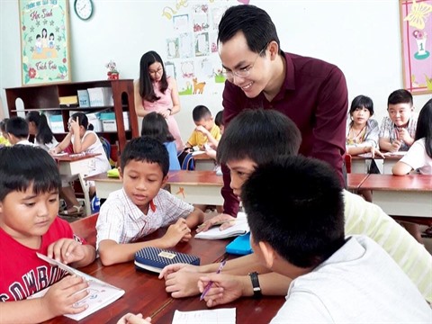 | Lê Hoàng Phong avec des élèves de la province de Tây Ninh. |