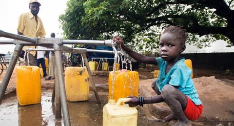 | Le 21 mars 2017, un enfant s'approvisionne à un point d'eau à Juba, au Soudan du Sud, pays frappé par une famine |