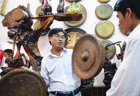 | L’enseignant Lê Huu Phong (gauche) présente sa collection de gongs. |