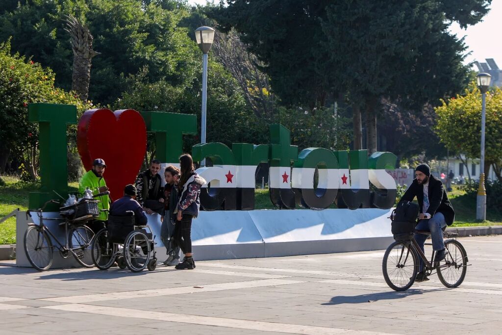 | Des Syriens à Tartous, dans l'Ouest de la Syrie, devant une enseigne peinte aux nouvelles couleurs du pays, le 17 décembre. |