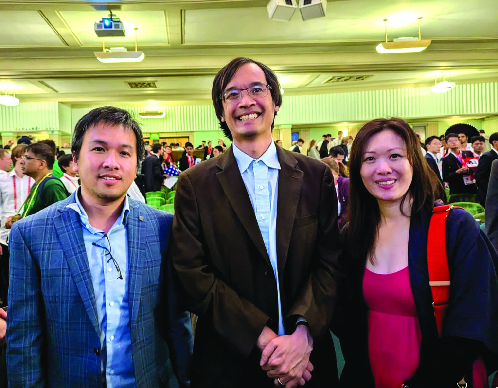 | Le Dr. Luong Minh Thang, entouré du mathématicien australien Terence Tao (centre) et de son épouse, Wendy Uyên Nguyên (droite). |