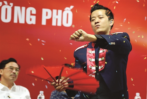 | Pham Truong Giang se produit lors de la conférence de presse sur le Festival des arts de rue, fin décembre 2015 à Hô Chi Minh-Ville. |