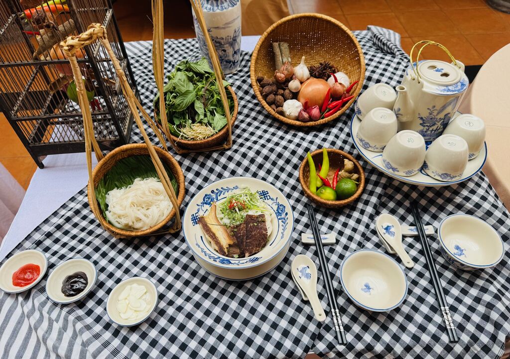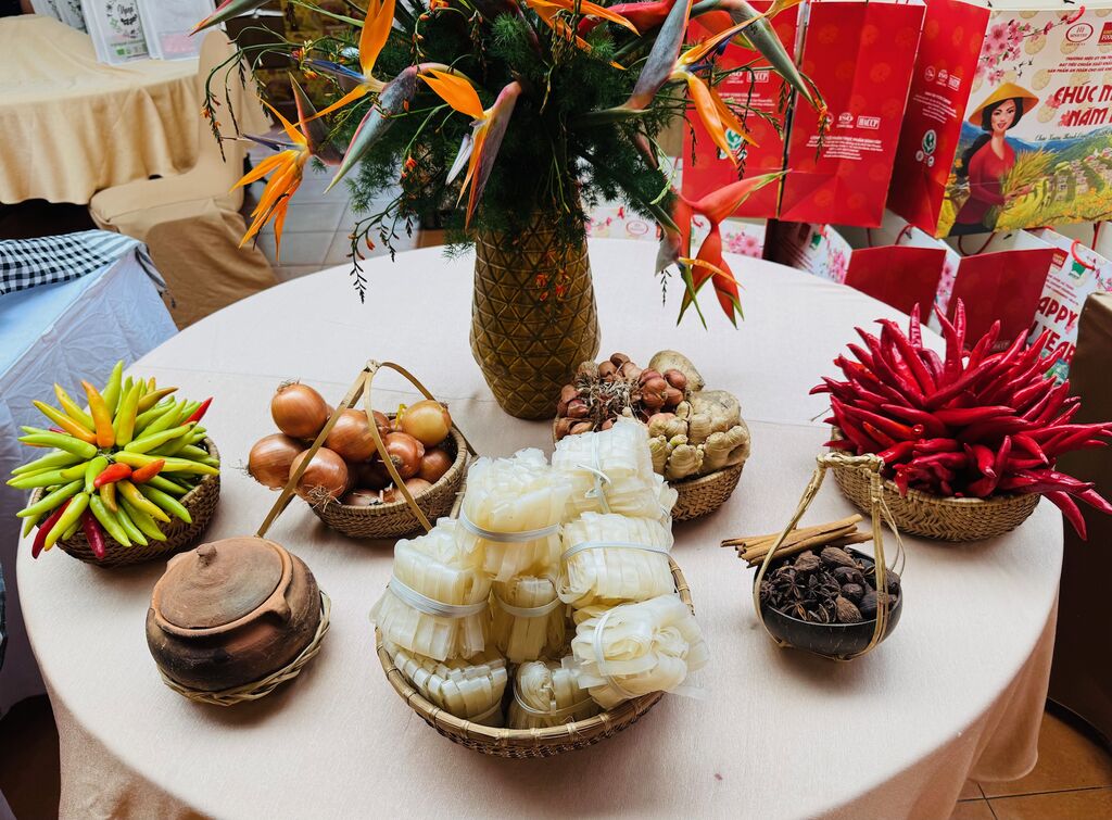| Épices et nouilles utilisées pour la préparation du pho exposées lors de la conférence de presse. |