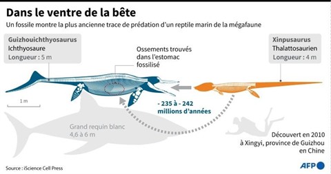 | Graphique sur la découverte d'un fossile montrant la plus ancienne trace de prédation d'un reptile marin parmi la mégafaune. |