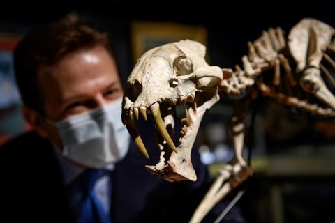 Estimé entre 60.000 et 80.000 francs suisses (entre 55.380 euros et 73.840 euros), ce specimen d'Hoplophoneus, nom scientifique de cette sorte de très gros lynx, mesurait 1m20 de long. "Il a été trouvé dans le Dakota du Sud durant la dernière saison de fouilles, vers la fin de l'été 2019", relate le collectionneur suisse Yann Cuenin, également propriétaire des autres lots de paléontologie.