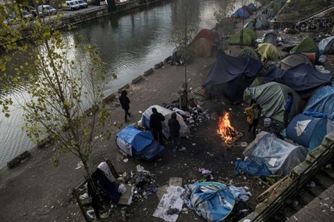 | Des migrants, la plupart Afghans, se réchauffent autour d'un feu le 23 février à Paris où un froid sibérien est attendu. |