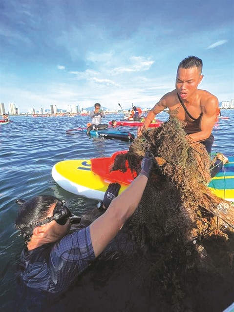 Généralement, à chacune de ces sessions, les pratiquants de SUP ramènent en moyenne 10 kg de déchets. De nombreux jeunes intéressés par ce travail aident également avec enthousiasme le directeur Trung. De nombreux filets usés qu’il a ramassés dans le fond marin ont été ramenés au rivage par les rameurs SUP.