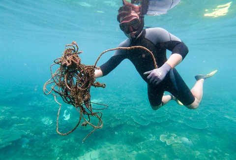| Trung (gauche) a eu besoin de 30 minutes pour couper et retirer ce filet attaché au corail. |