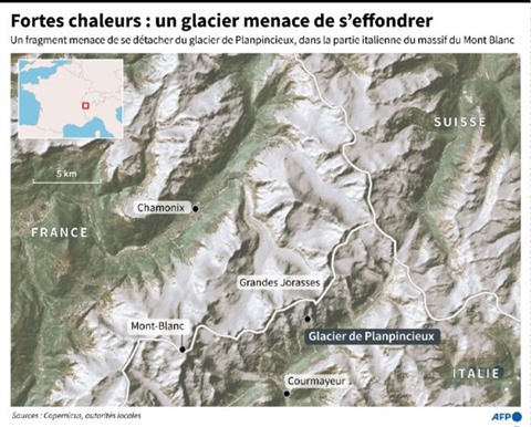 Un volume de glace estimé à 500.000 mètres cube est le point de se détacher du glacier de Planpincieux, sur le territoire de la commune de Courmayeur, selon les responsables de cette municipalité de la région du Val d'Aoste située près de la frontière avec la France.