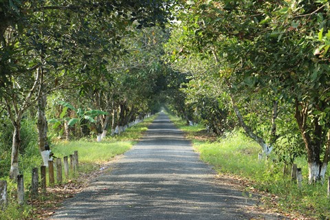 | Chemin menant au cœur de la forêt d’U Minh Ha, bordé de jacquier. |