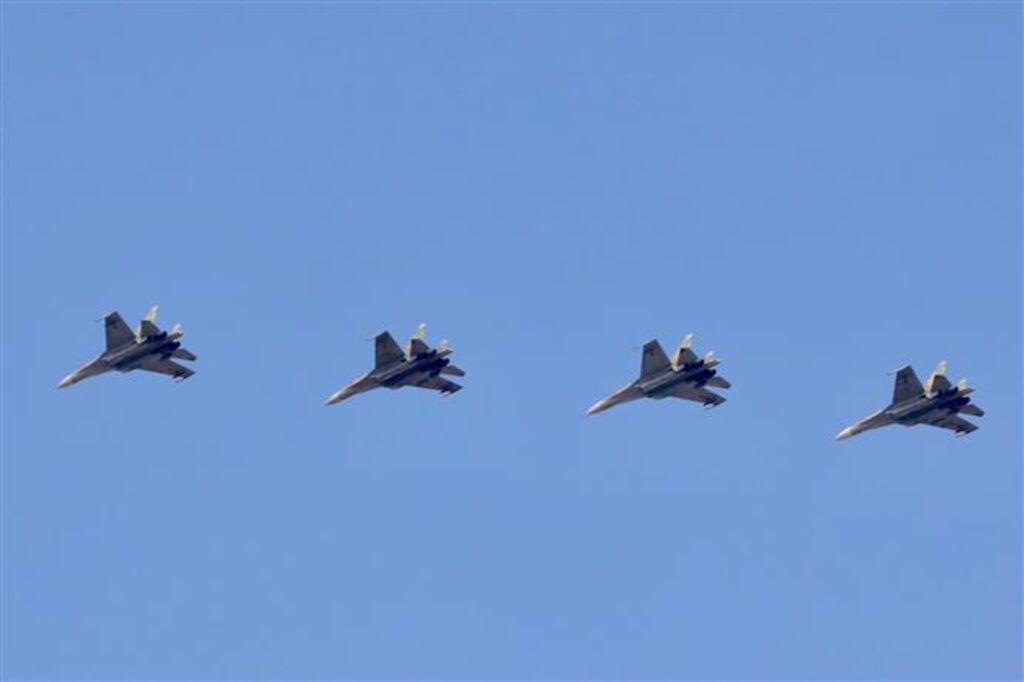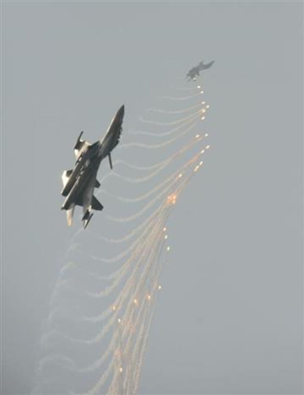 | Des Su-30MK2 impressionnent avec leurs démonstrations de largage de leurres thermiques. |