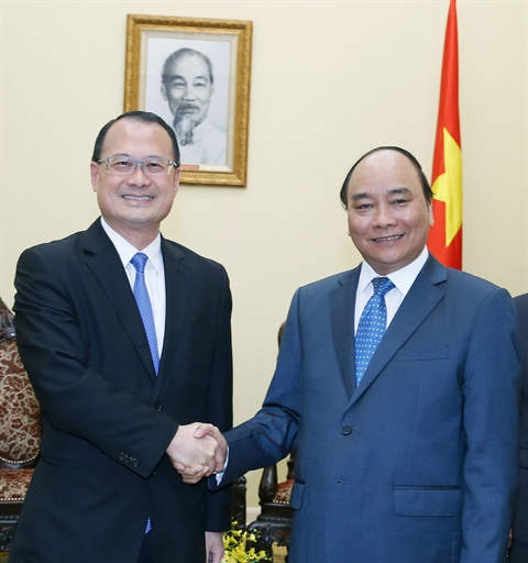 | Le Premier ministre vietnamien Nguyên Xuân Phuc (droite) et le président du groupe hongkongais Sunwah, Jonathan Choi, le 21 avril à Hanoi. |