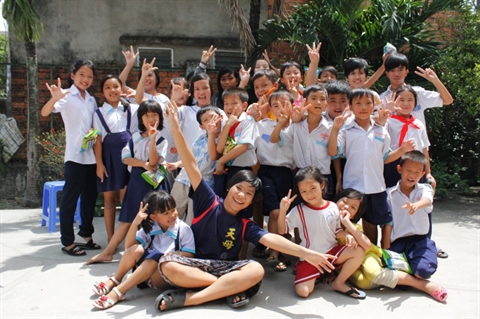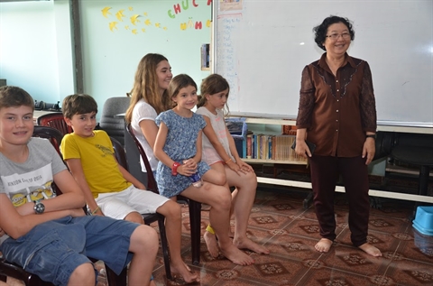 | Hông Tô Huê Lan et de jeunes enfants français en visite au CEPORER de Hoc Môn. |