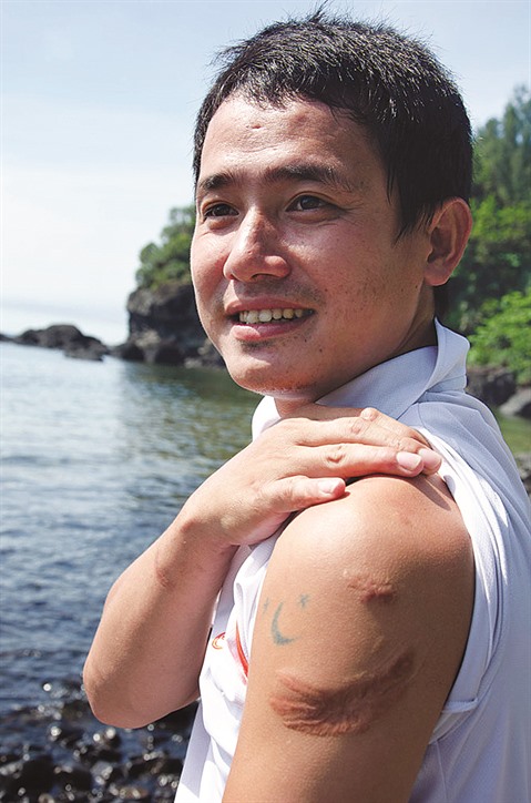 | Le plongeur Pham Thu montre les morsures d’un requin blanc au bras. |