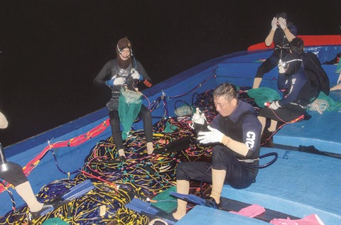 | Chaque nuit, les plongeurs de Phu Quy doivent s’équiper d’armes pour se défendre en cas d’attaques de requins blancs. |