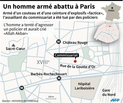 À 11h30, cet homme porteur "d'une arme blanche de type feuille de boucher" et d'un dispositif explosif factice "s'est présenté devant le commissariat du 18e arrondissement, a exhibé son arme et crié +Allah Akbar+ (Dieu est le plus grand, en arabe, NDLR) avant d'être abattu par les policiers en faction", a annoncé le procureur de la République de Paris, François Molins, dans un communiqué.