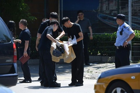 | Des agents de sécurité (centre) relèvent des indices après une explosion devant l'ambassade des États-Unis à Pékin, le 26 juillet. |
