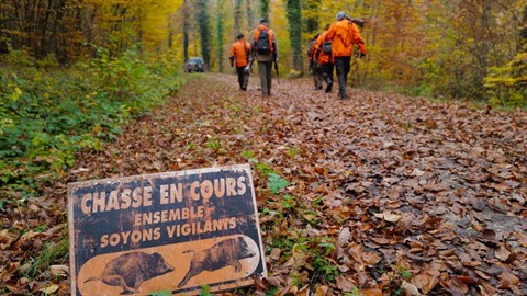 | Un groupe de chasseurs lors d'une battue au sanglier. |