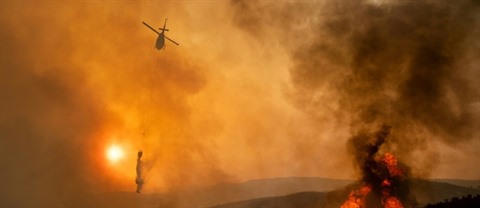 | Un hélicoptère lutte contre les flammes de l'incendie du Mendocino Complex, le 5 août en Californie. |