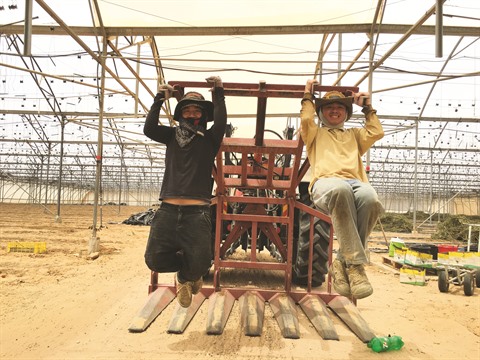 | Tang Phu Dinh (droite) et un collègue dans une vaste serre de tomates en Israël. |