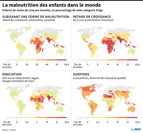 149 millions d'enfants dans le monde sont ainsi trop petits pour leur âge (retard de croissance en raison d'une malnutrition chronique) et 50 millions, trop maigres par rapport à leur taille (émaciation, liée à une malnutrition aigüe et/ou à un problème d'absorption des nutriments).