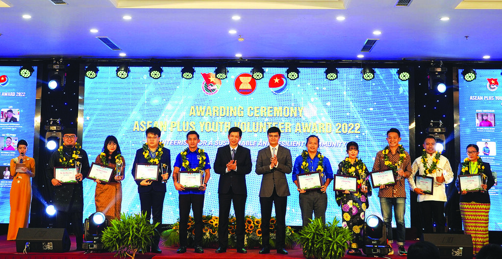 | Hoàng Hoa Trung (5e à droite) lors de la cérémonie de remise des prix "Jeunes volontaires de l’ASEAN élargie 2022", le 26 août 2022 à Quang Binh (Centre). |