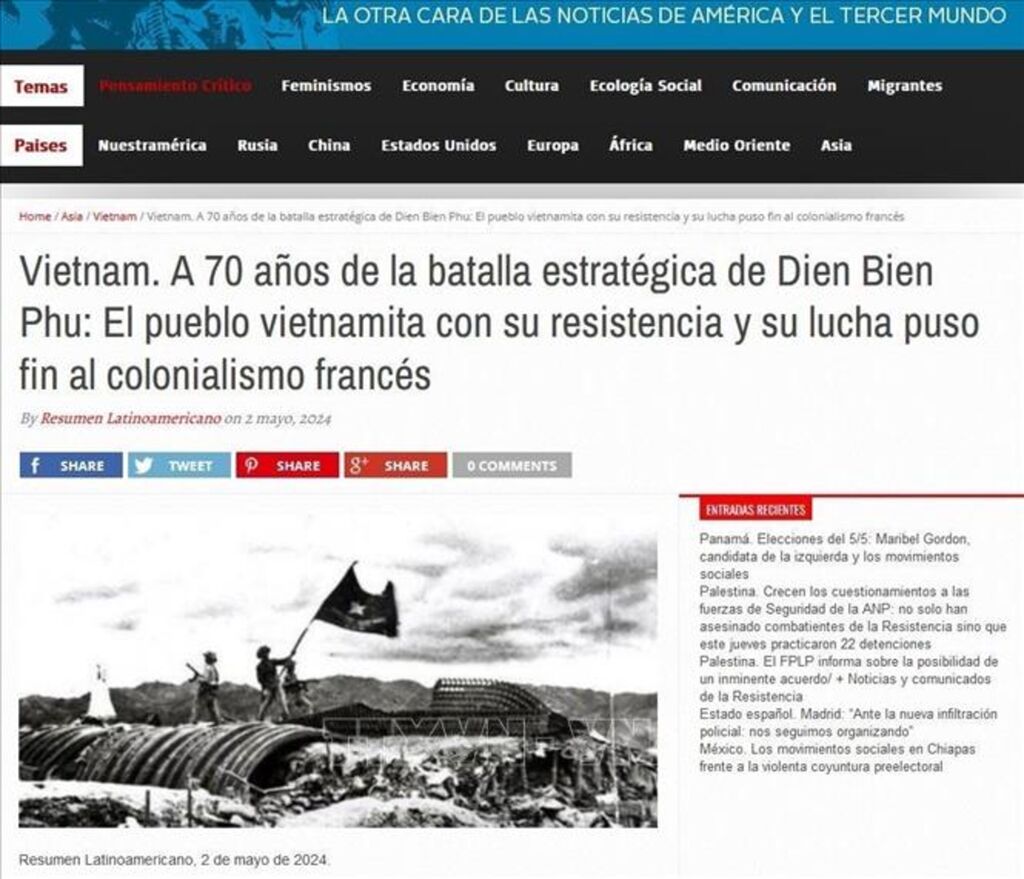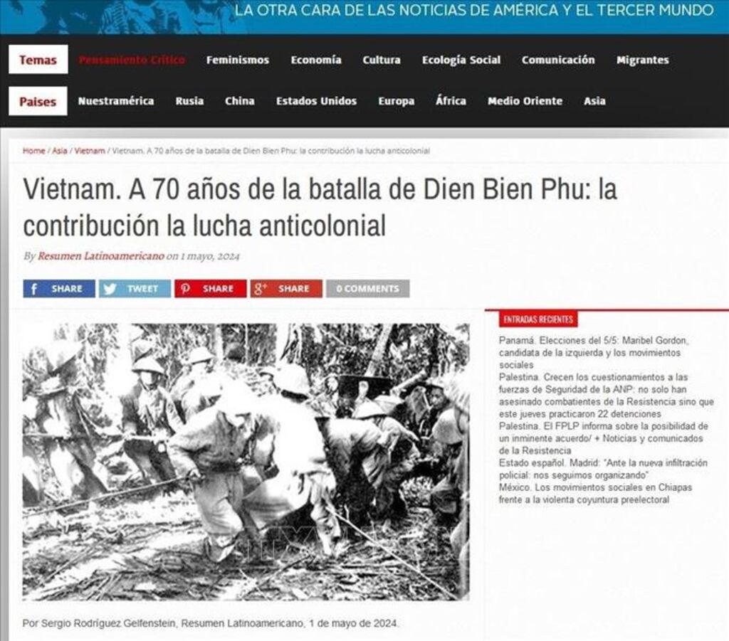 | Capture d'écran d'un article publié le 2 mai 2024 dans le journal argentin "Resumen Latinoamericano", louant la grande Victoire de Diên Biên Phu du peuple vietnamien en 1954. |
