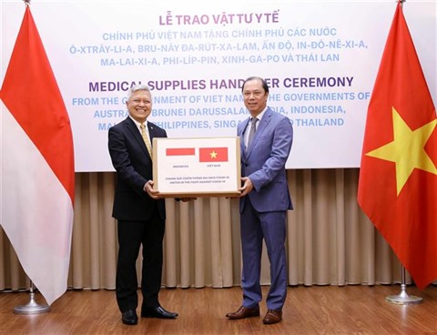 | Le vice-ministre des Affaires étrangères, Nguyên Quôc Dung (droite), a remis symboliquement, le 18 mai à Hanoï, de fournitures médicales au gouvernement indonésien. |