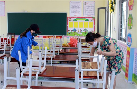| Des enseignants dans une école primaire située dans la province de Bac Giang (Nord) nettoient une salle de classe pour l'accueil des élèves à l'école. |