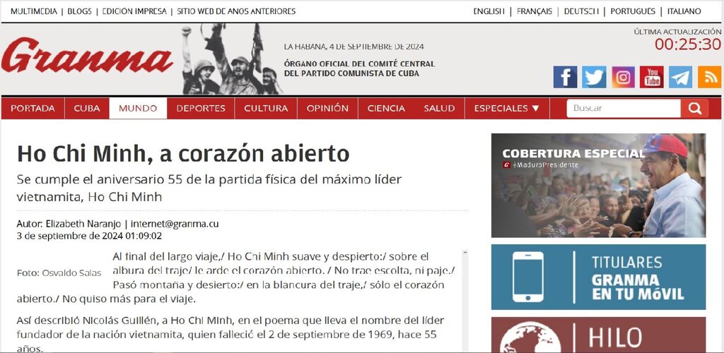 | Capture d’écran de l’article faisant l'éloge du Président Hô Chi Minh, publié dans le journal Granma. |