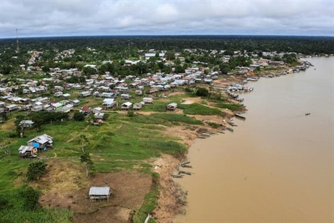 | Photo aérienne prise le 20 juin 2020 de la rivière Javari à Atalaia do Norte, dans l'État d'Amazonas (Nord du Brésil). |