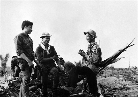 | Des journalistes de la VNA en mission à Cu Chi, en banlieue de Hô Chi Minh-Ville, en avril 1975. |
