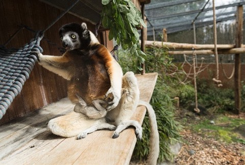 | Poppy, maman d'un propithèque couronné de la famille des lémuriens né mi-février, allaite son bébé, le 5 mars au parc zoologique de Mulhouse, à Madagascar. |
