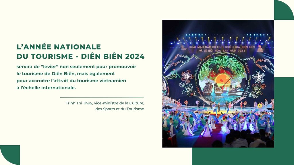 Placée sous le thème “Gloire de Diên Biên Phu - Expériences infinies”, l’Année nationale du tourisme - Diên Biên 2024 promet d’être un événement socioculturel et économique à l’échelle nationale et d’envergure internationale. Elle coïncide avec la célébration du 70e anniversaire de la victoire historique de la bataille de Diên Biên Phu (7 mai 1954). Proposant une multitude d’activités, cette manifestation importante devrait contribuer à la prospérité socio-économique et à l’essor du tourisme de Diên Biên.