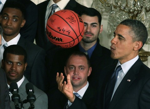 | Barack Obama (droite), alors président des États-Unis, joue avec un ballon de Basket le 4 mai 2012 à la Maison Blanche en recevant l'équipe de l'université du Kentucky. |
