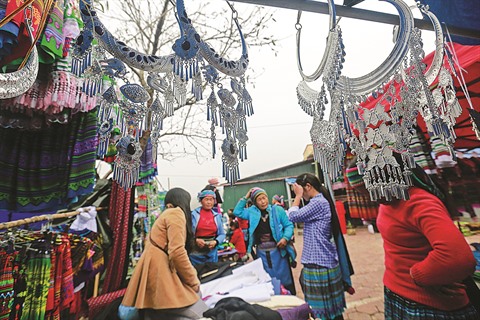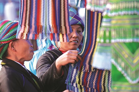 | Des femmes H’mông sur un stand de vêtements du marché d’Y Ty. |