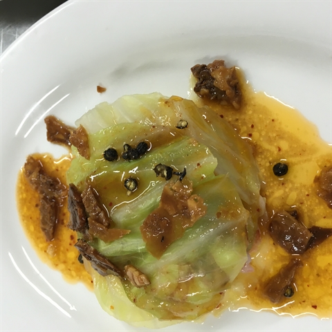 Les crevettes, mœlles de bœufs et poutargue sont délicatement placées entre les feuilles de chou vert. Le montage est ensuite cuit à la vapeur, puis rehaussée d’une sauce à l’huile d’olive et au jus des têtes de crevettes. Le tout est décoré avec les morceaux de nougatine d'ail grillée pendant 20 minutes à 150oC.