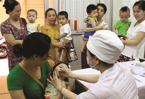 | Des enfants se voient administrer une cure de vitamine A dans le poste de santé du quartier de Pham Dinh Hô, arrondissement de Hai Bà Trung, Hanoi. |