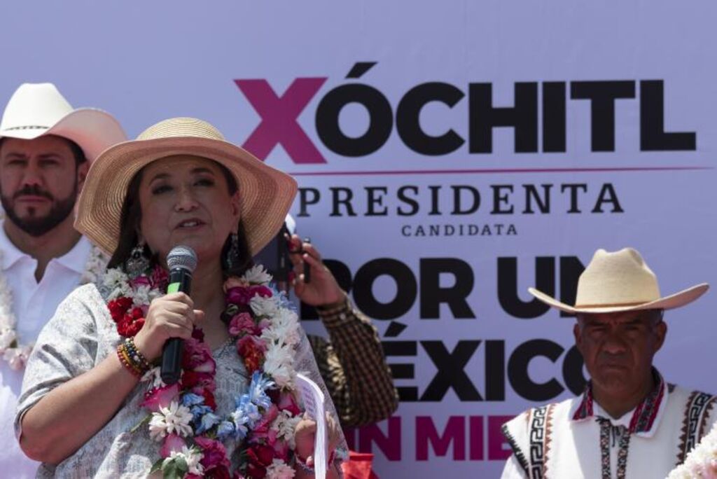 | Des supporteurs de la candidate de l'opposition à la présidentielle Xochitl Galvez se réunissent à Atlacomulco, près de la capitale Mexico, le 24 mai 2024. |