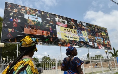 | Des Ivoriennes passent près d'un panneau annonçant la tenue du Masa, Marché des arts du spectacle africain d'Abidjan, le 9 mars 2018. |
