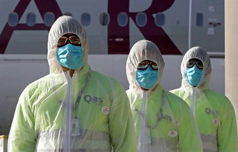 | Des employés de Qatar Aviation Services (QAS) en tenues de protection sur le tarmac de Doha, le 1er avril. |