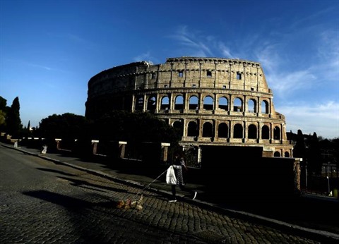 | Une femme promène son chien près du Colisée à Rome le 2 avril. |