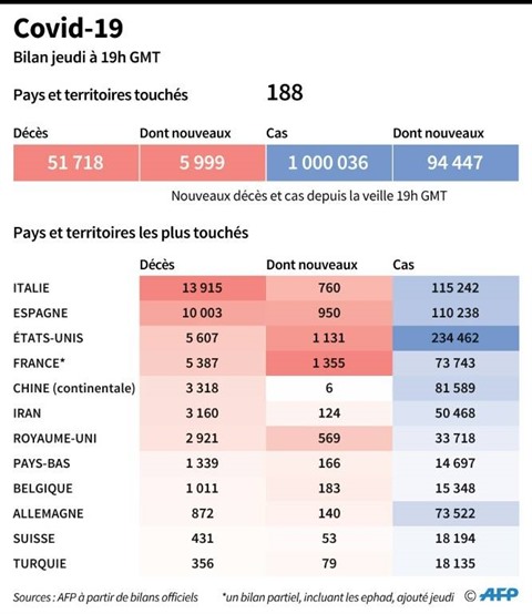 La moitié de l'humanité fait l'objet de mesures de confinement. Au moins 1.000.036 cas d'infection, parmi lesquels 51.718 décès, ont été détectés dans le monde, selon un comptage de l'AFP.