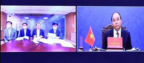 | Le président de la République, Nguyên Xuân Phuc (droite), lors de sa séance de travail virtuelle avec le président de l’Association d’amitié République de Corée - Vietnam, Choi Young-joo. |