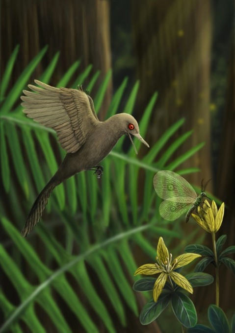 | Vue d'artiste transmise le 10 mars 2020 par l'Université chinoise de géosciences, montrant un "oculudentavis khaungraae", oiseau vivant il y a des millions d'années et qui pourrait être le plus petit dinosaure connu à ce jour. |
