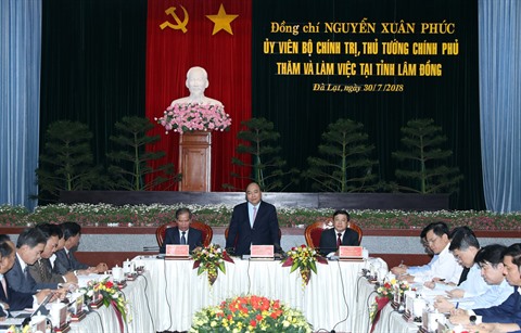 | Le Premier ministre Nguyên Xuân Phuc (debout) lors d'une séance de travail lundi 30 juillet à Lâm Dông avec les autorités locales. |