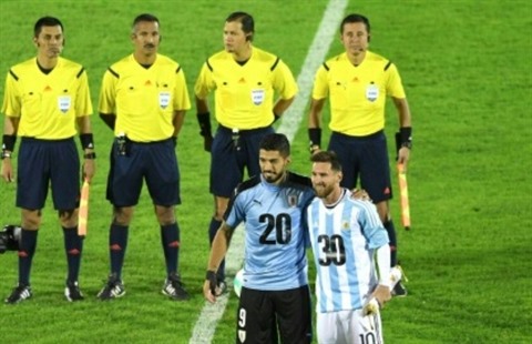 | L'Uruguayen Luis Suarez (1er plan, gauche) et l'Argentin Lionel Messi posent en soutien de la candidature de leurs pays à l'organisation du Mondial-2030, le 31 août 2017 à Montevideo. |