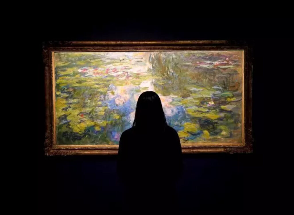 | Une personne contemple "Le Bassin aux nymphéas" du peintre impressionniste Claude Monet, le 4 mai 2021 chez la société d'enchères Sotheby’s. Le chef d'oeuvre a été vendu 74 millions d'USD par la concurrente Christie's à New York, le 9 novembre 2023. |
