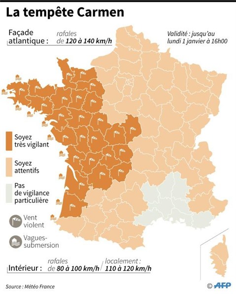 Carmen, la troisième tempête hivernale après Ana et Bruno en décembre, est annoncée pour lundi matin 1er janvier, mais dès dimanche après-midi 31 décembre 2017 l'Ouest du pays a été touché par des pluies parfois soutenues accompagnées de rafales de vents de 60 à 80 km/h ainsi que par de "fortes vagues" sur le littoral.
